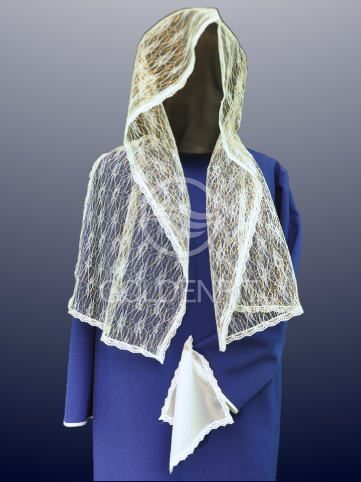 Шарф белый гипюр с золотом с отделкой кружевом и платком в руку