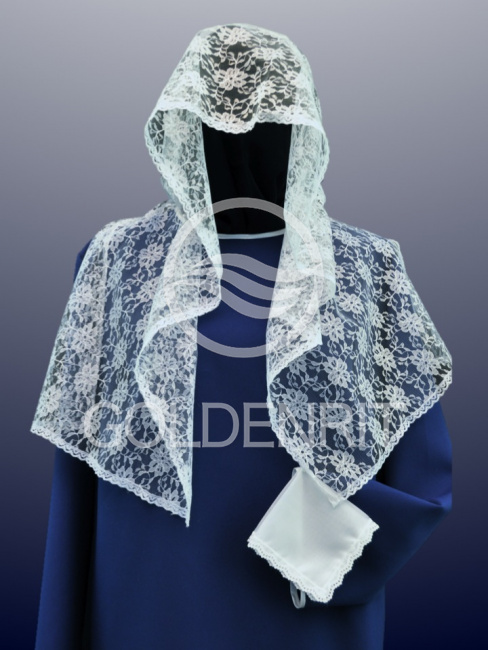 Шарф белый гипюровый с отделкой кружевом и платком в руку