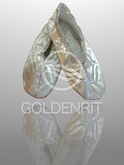 Тапочки из атласной серебряной термостежки изготовлены в нашей швейной мастерской по всем стандартам ритуальной обуви.