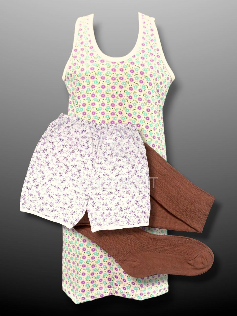 трикотажная "бабушкина" майка, панталоны и чулки