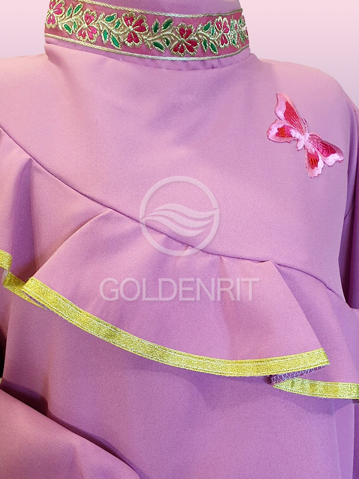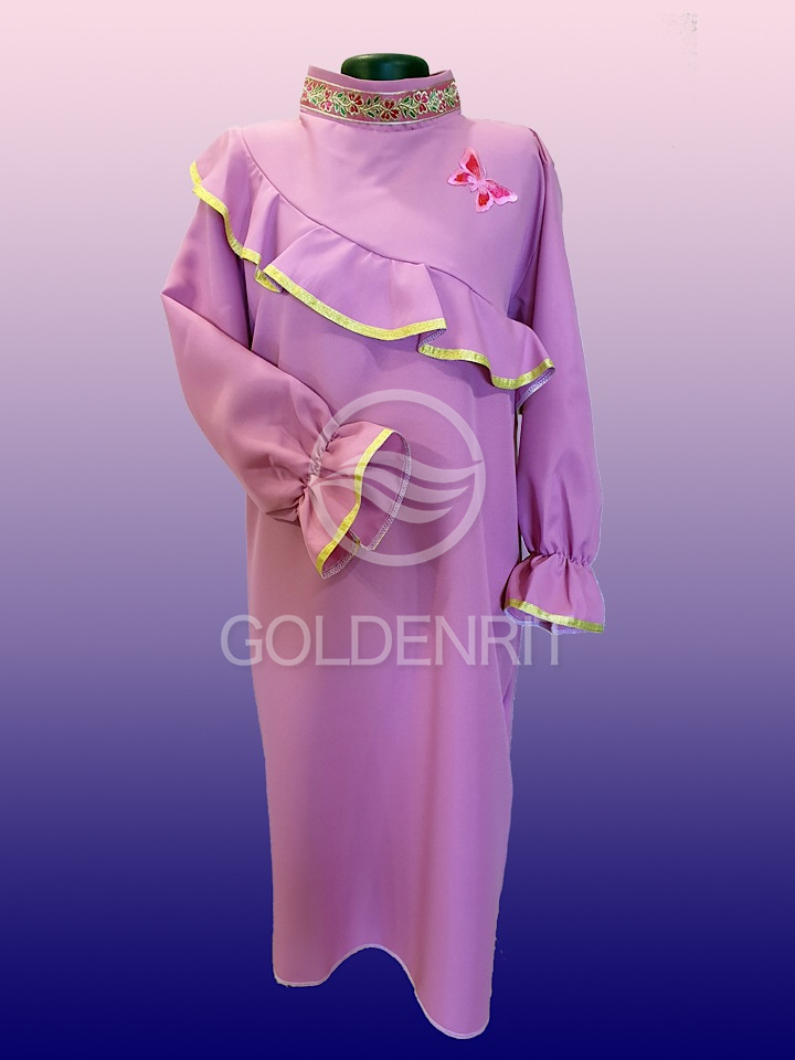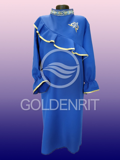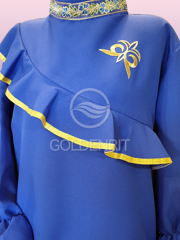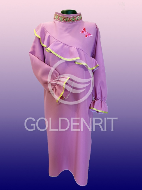 Отделка: волан с отделкой золотой тесьмой и манжеты на резинке.