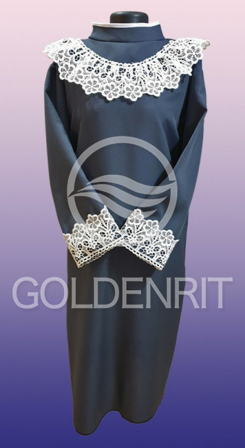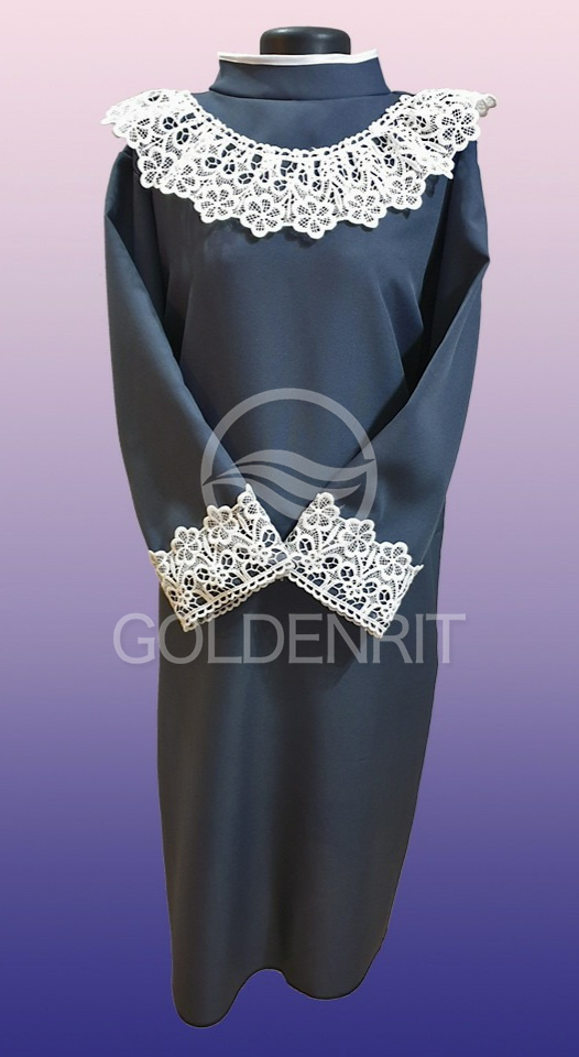 Превосходное женское платье с воротником стойкой и нарядным ажурным кружевом.