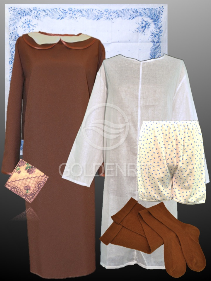 панталоны, чулки, платок на голову, платок в руку.