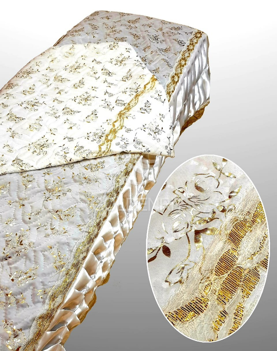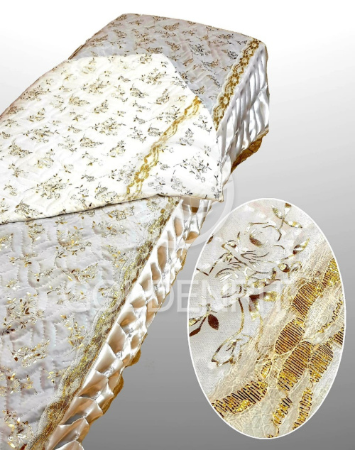 Роскошный комплект из драпированного атласа и термостежки с золотыми цветами.