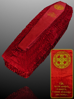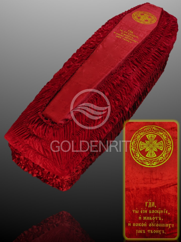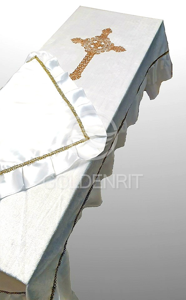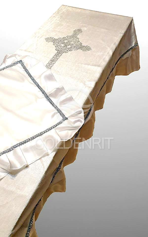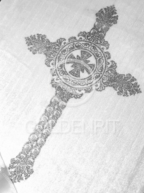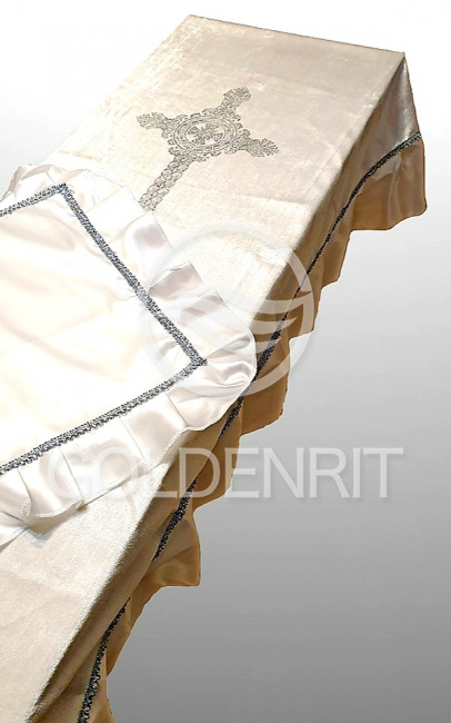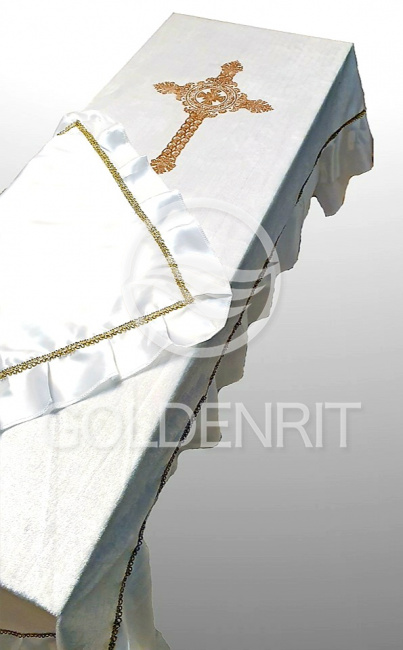 Скомбинирован из белого бархата и атласа с золотым или серебряным теснением на выбор.