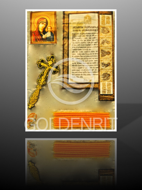 Состав набора: икона бумажная ламинированная, крест черный пластиковый, крест нательный, гайтан, 6 свечей, молитва. В наличии 2 вида набора: Спаситель и Казанская.
